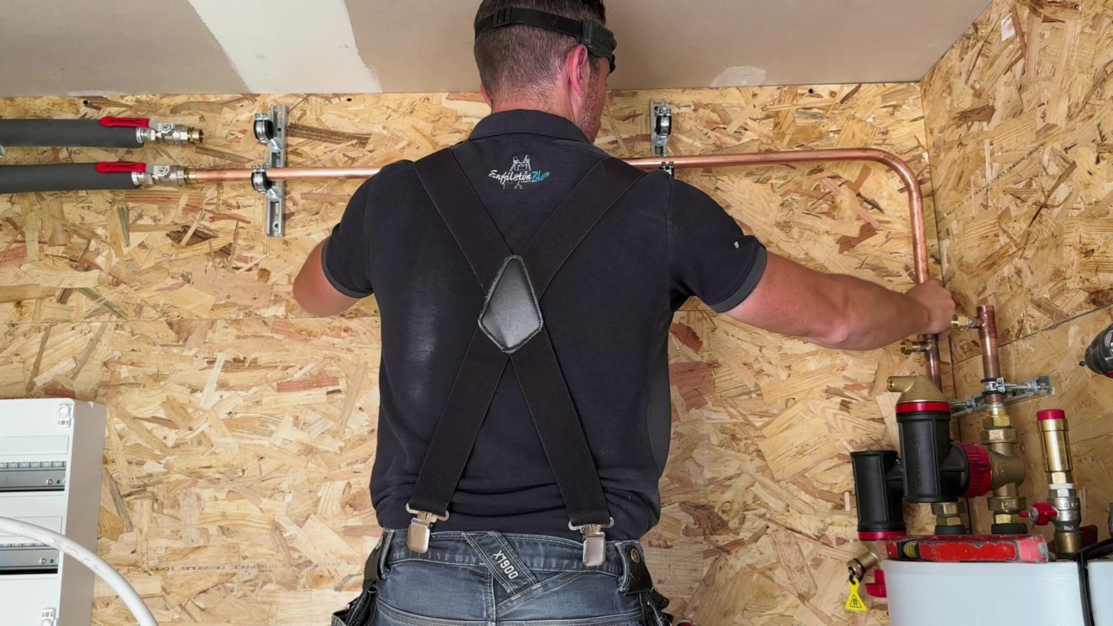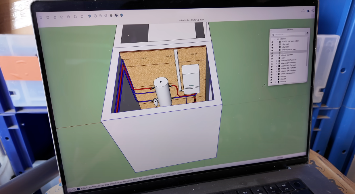 La contrainte majeure de ce chantier : la distance ! Pour le mener à bien, j’ai décidé de fabriquer toute la chaufferie à l’atelier, sur des plateaux d’OSB, puis de livrer l’installation directement sur place.